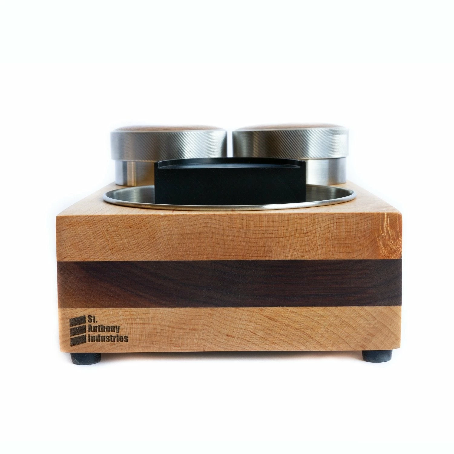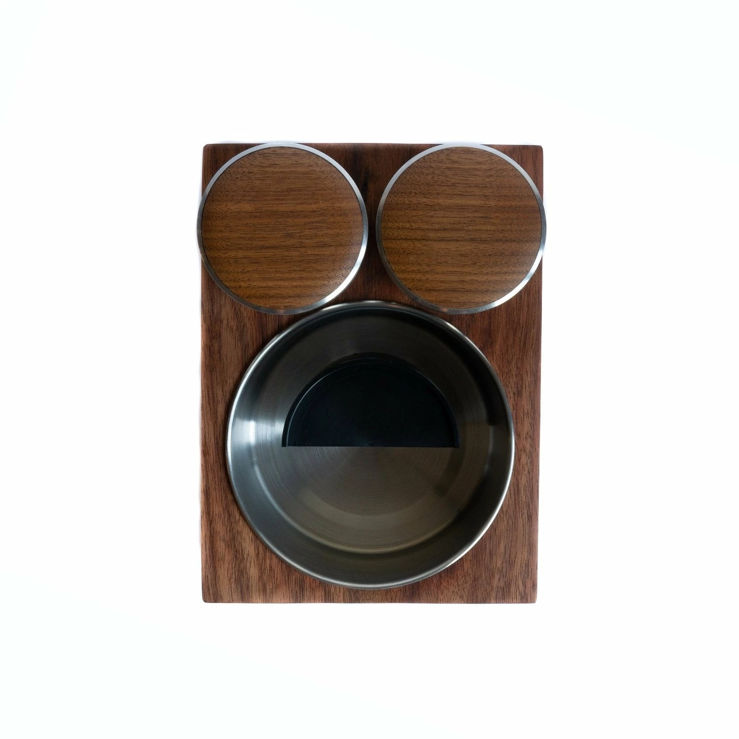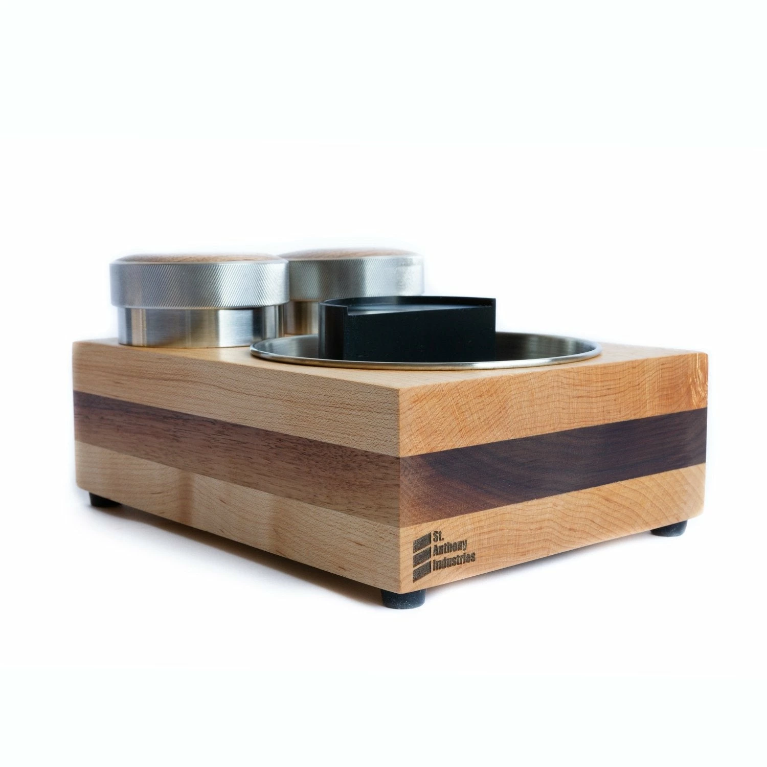 A rest for your BT Wedge Distribution Tool. A rest for your New Levy Tamper. A tamping stand for your portafilter. And last but not least, a knock box. This beautiful tamping station brought to you by Saint Anthony Industries is made of American Hardwood and measures 190 x 140 x 70mm. The stainless steel reservoir holds about six standard pucks and is easily removable and dishwasher safe.