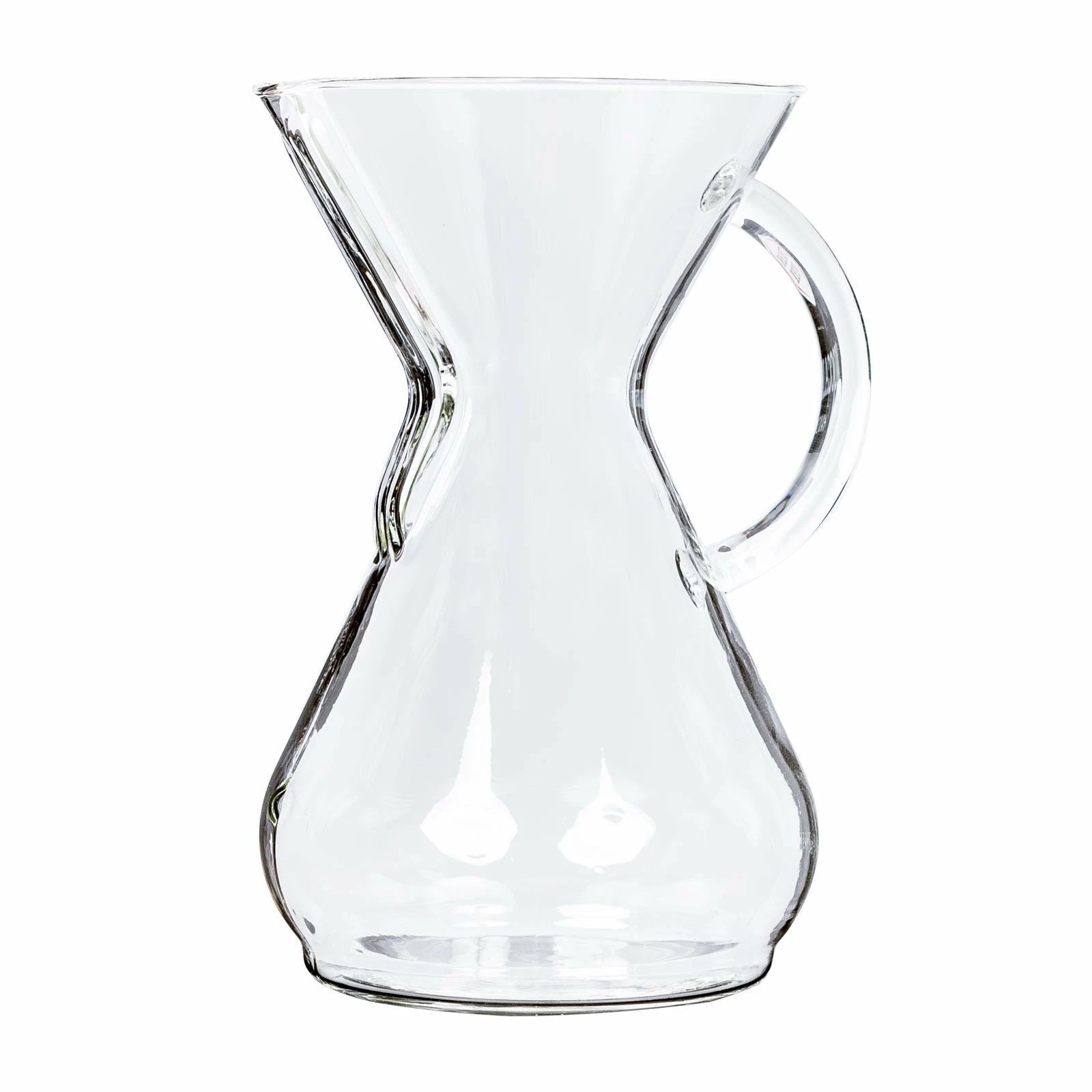 This eight cup glass handle coffeemaker includes a heat resistant, hand blown hourglass carafe with a loop handle for effortless pouring. Dishwasher safe and holds up to 40 oz. Chemex filters sold separately.