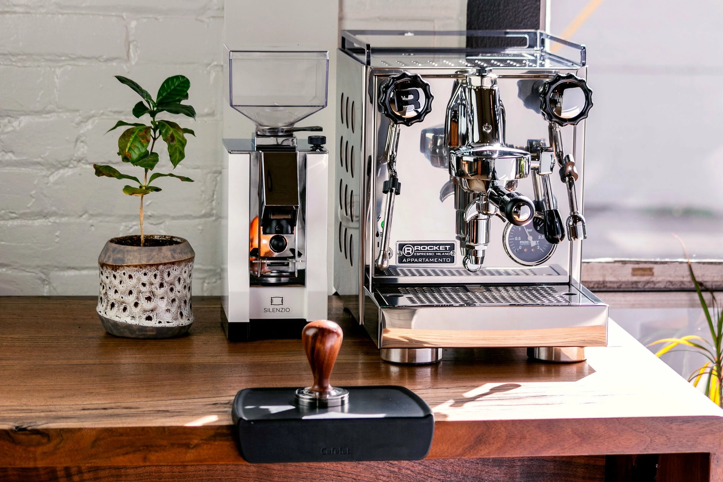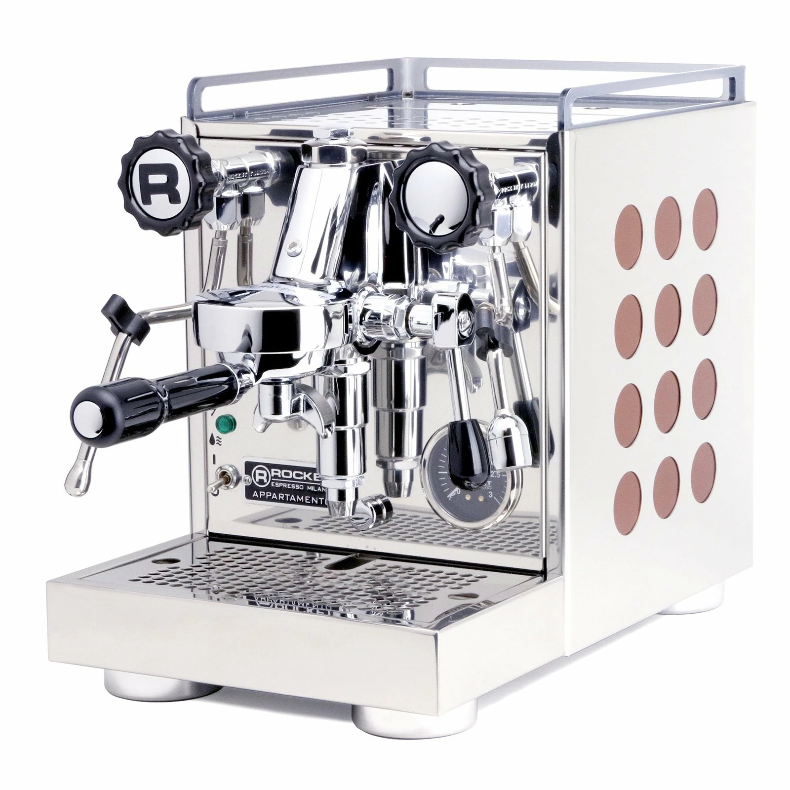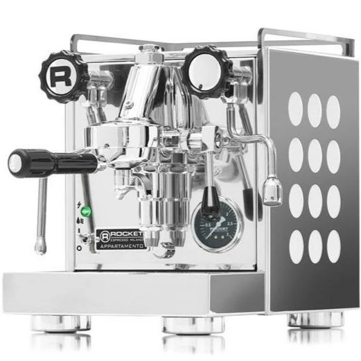 The Rocket Appartamento is a heat exchanger espresso machine with an E61 group head and a vibratory pump that runs on an internal reservoir.