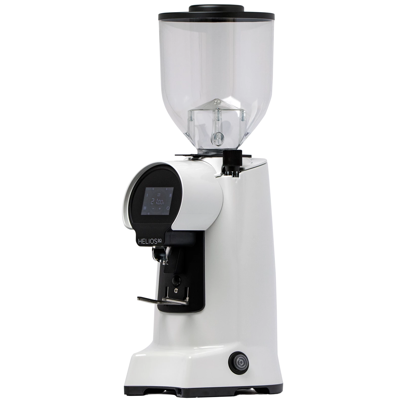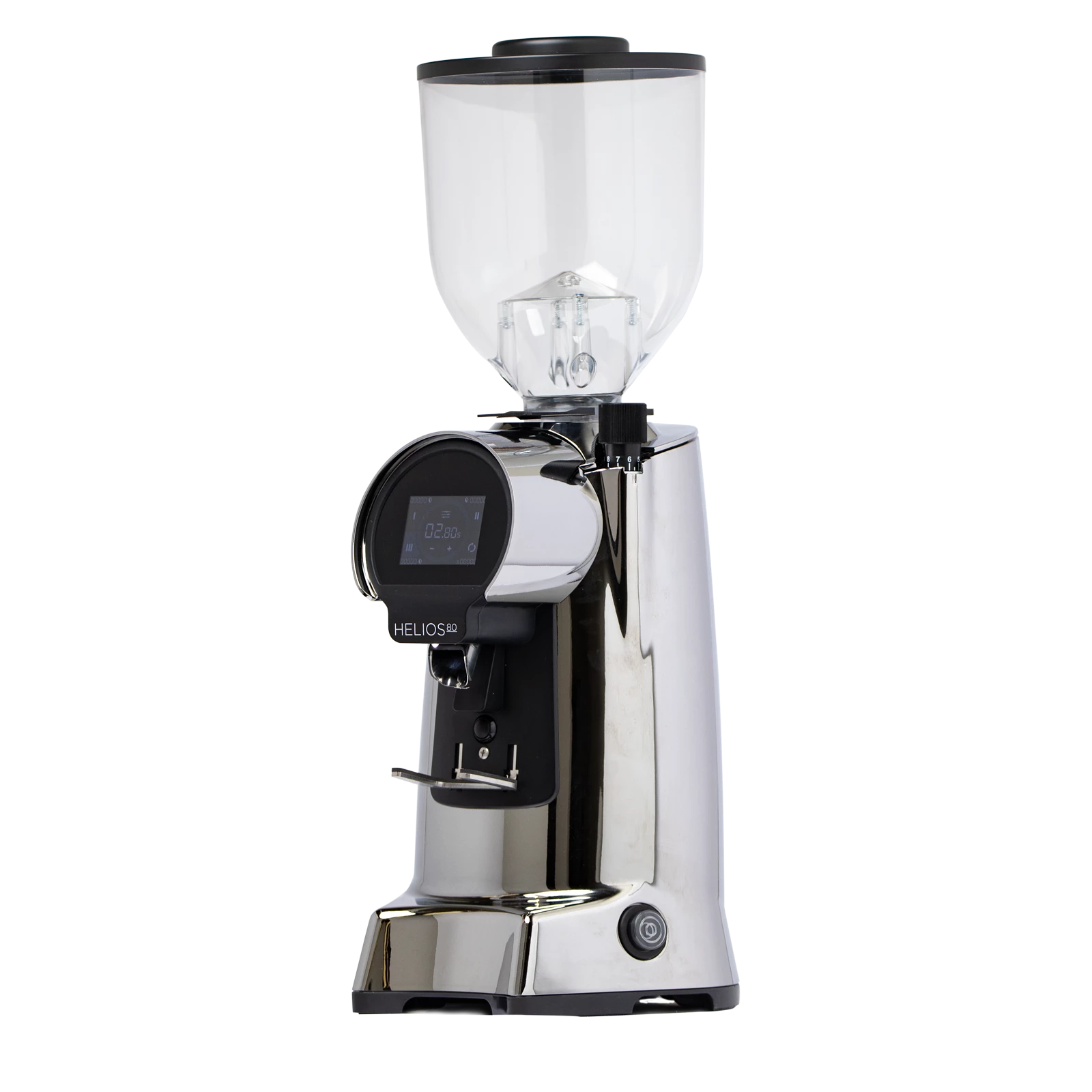 The Eureka Helios 80 is a commercial espresso grinder with 80mm flat steel burrs designed to give café owners, coffee roasters, and lead baristas ultimate control over every shot of espresso. The touchscreen allows users to program grind times, counters, and display options — including brightness, color, language, and password-protected settings to control what other users can and can’t adjust. It’s a workhorse and can grind 20g of coffee in under two seconds with low heat transfer to the grounds. This grinder requires a 20 amp circuit.