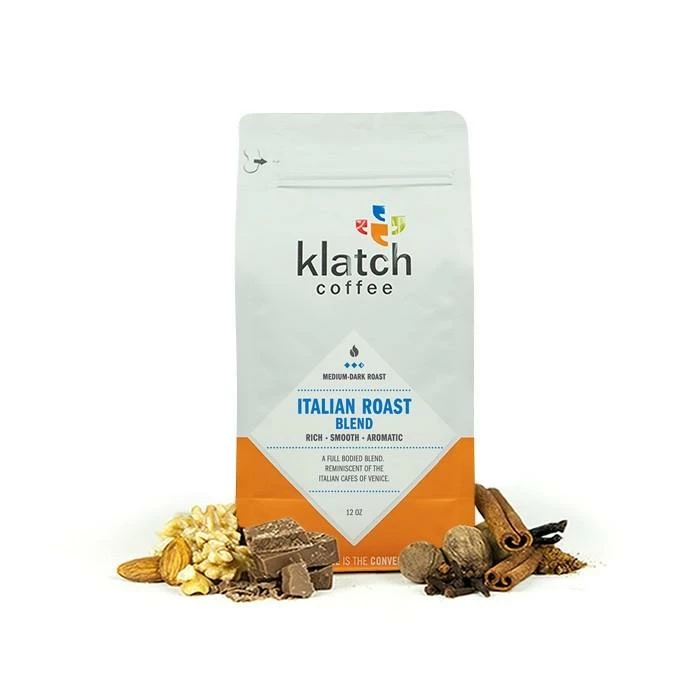 The Italian Roast was carefully roasted for you by Klatch Coffee. This full bodied blend is unlike most Italian roasts you are used to. This medium roast will give you a taste of the romantic Italian cafes of Venice, as if you are sitting alongside the canals with a wonderful cup of coffee in your hand. The cup is rich and smooth with notes of roasted nuts.
