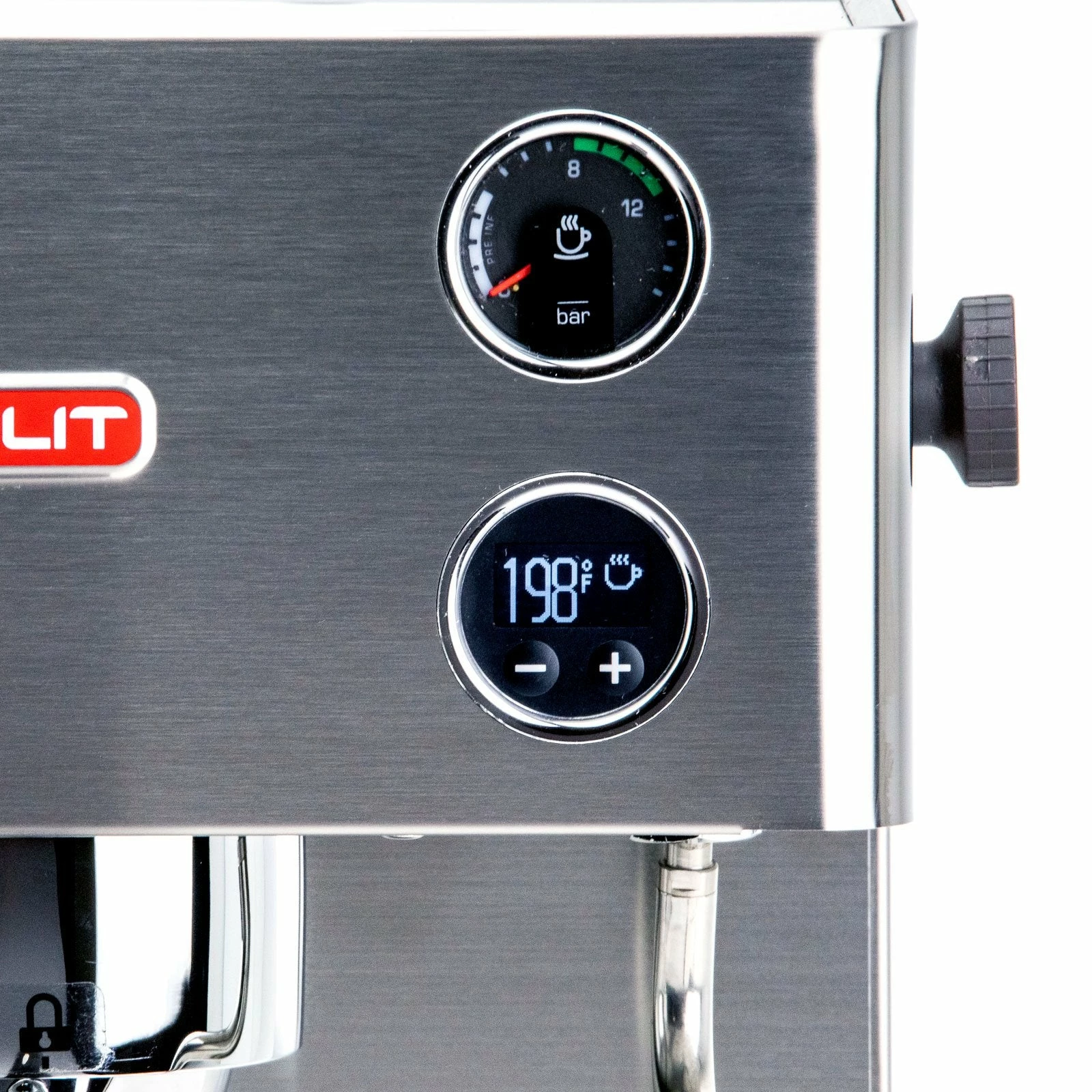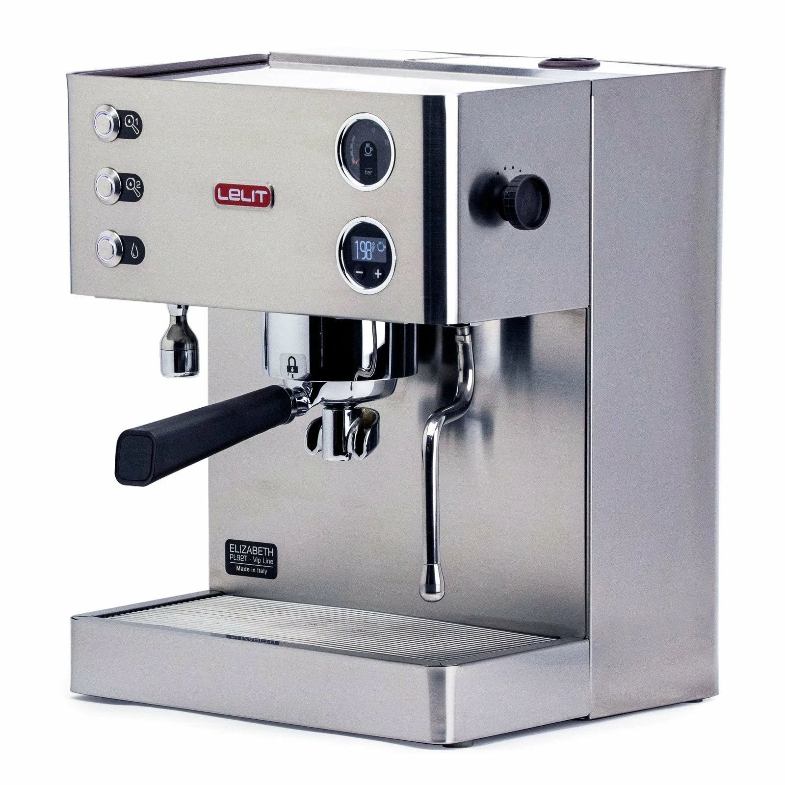 The Lelit Elizabeth is an Italian-designed and built dual boiler, vibratory pump, saturated group head espresso machine with a built-in PID, and shot timer that runs on a built-in reservoir. It sports impressive 2 bar steam pressure, programmable shot buttons, and a mixing valve for hot water.