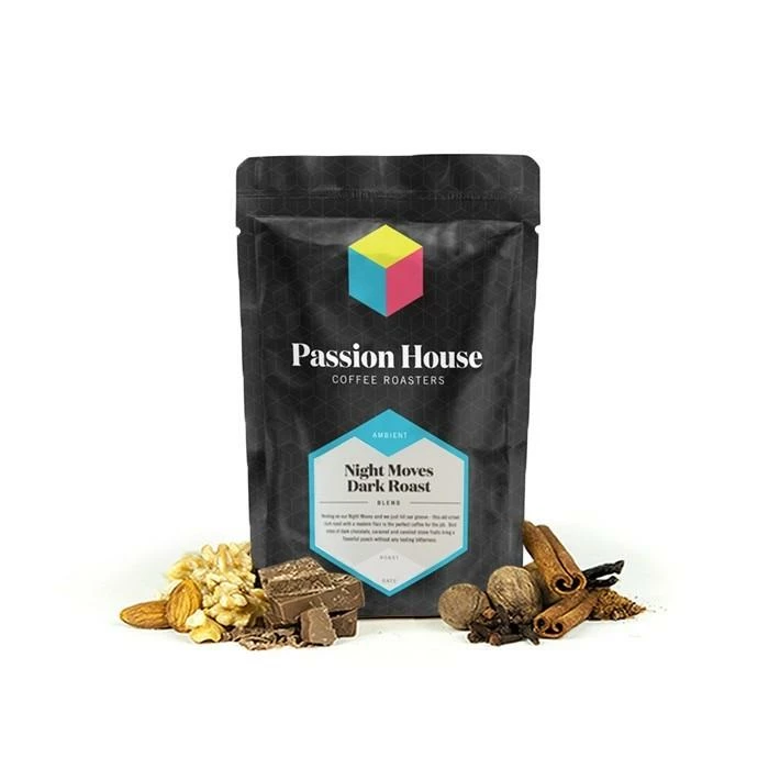 This is the Night Moves Blend brought to you by Passion House Coffee Roasters. The Night Moves blend is a deeper roast that appeals to those who love drinking medium dark roasted coffee but without the bitterness they might expect. We think this coffee is bold, rich and comforting, with notes of chocolate and caramel.