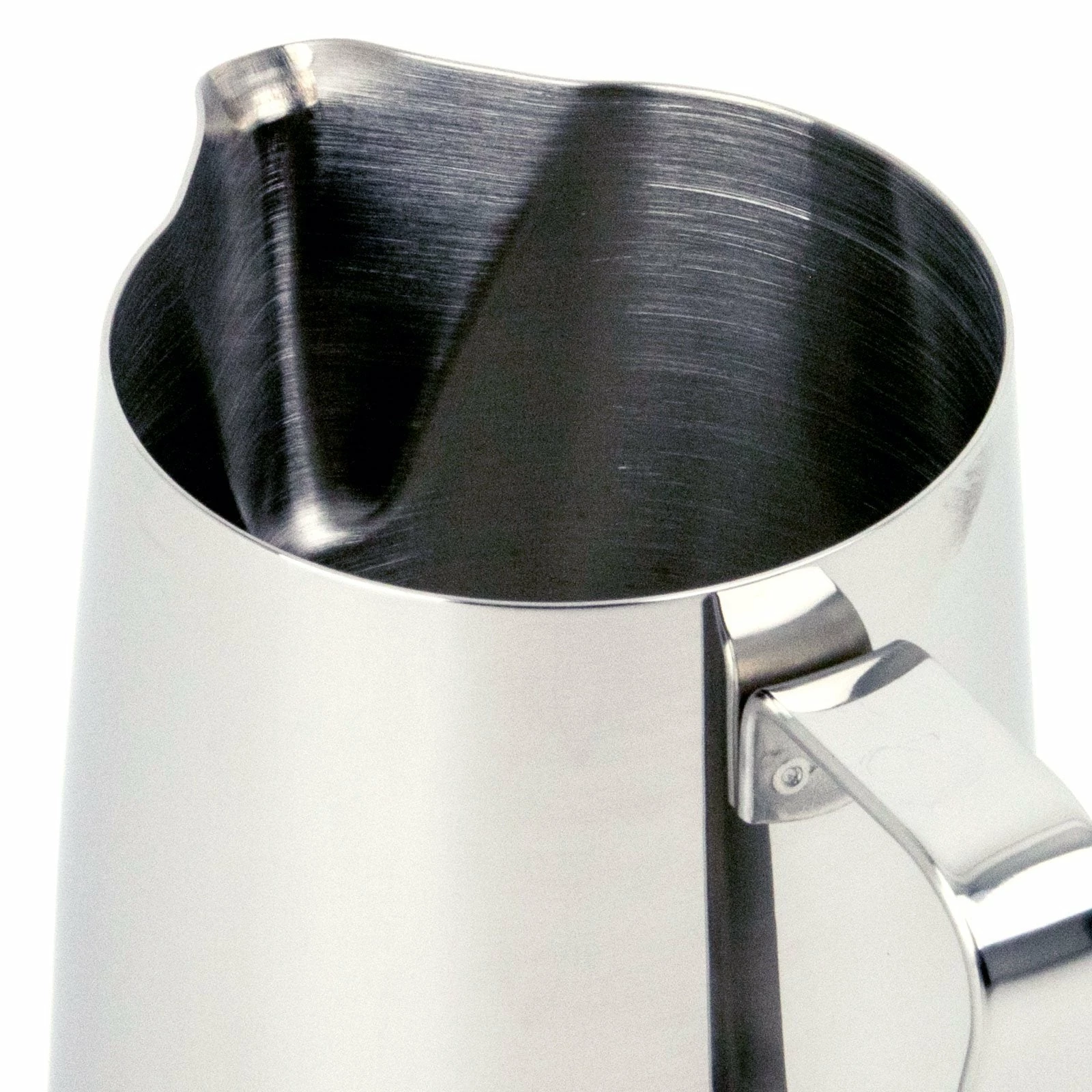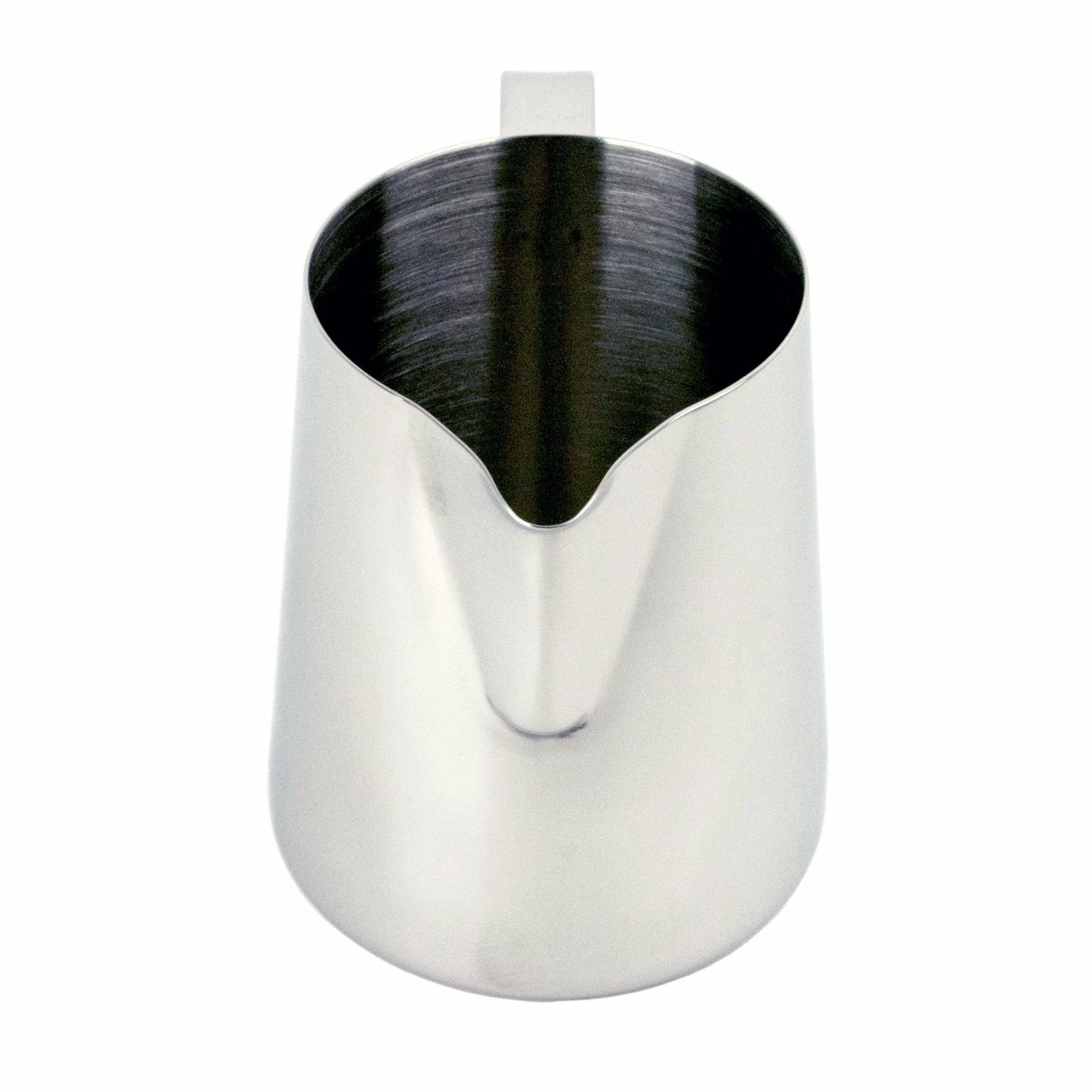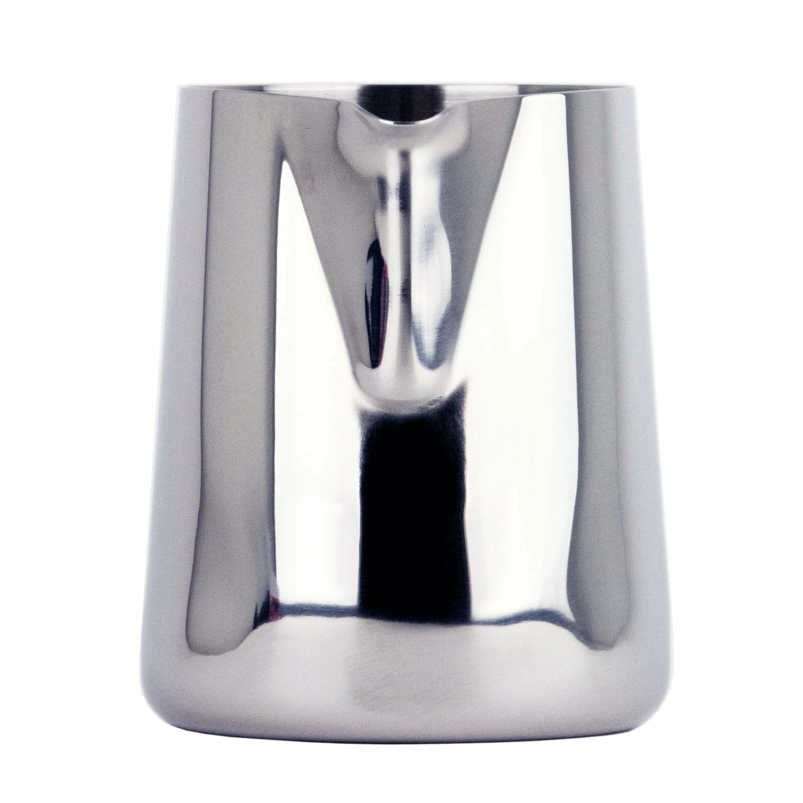 Rhino Coffee Gear has built a name for themselves by producing well-crafted espresso barware at reasonable prices. This pitcher is no exception: its comfortable handle and neatly formed spout provide the control you need to pour latte art. Its stainless steel construction will hold up to drops and so will that premium chrome finish on the outside.